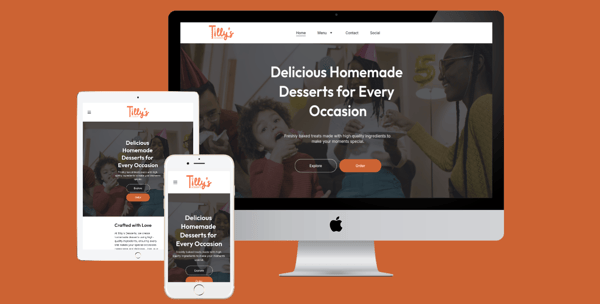 Deliverables for this project include a brand identity (logo), a user-friendly website, business cards, a menu, and a range of marketing materials including vinyl banners, table runners and flyers—all designed to help Tilly’s Desserts make a lasting impression.